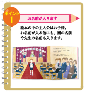 お子さまが入園してから卒園までのエピソードが絵本に綴られます。