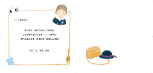 | (20ページ以下はフリーページです) (20〜21ページ) ![]() (22ページはメッセージのページです。お好きなメッセージを入れられます) (22〜23ページ) ![]() (メッセージ例) 〇〇ちゃんへ そつえん おめでとう。 しょうがくせいになる ○○ちゃん。 おべんきょうも あそびも たのしんでね! パパ と ママ より |