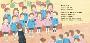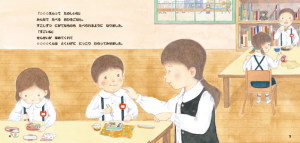 ![]() 16〜17ページ あたらしい せいふく ぴかぴかの つくえや きょうかしょに かこまれて ●●くんは ごきげんです。 「ほら、みて。かっこいい くろいろの ランドセル」 けれど 「おともだちは できるかな。 おべんきょうは できるかな」 すこし しんぱいに なりました。 |