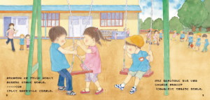 ![]() 8〜9ページ (8ページ) おそとあそびの とき ブランコに のりたくて おともだちと とりあいに なりました。 ●●くんは くやしくて なみだをひっしに こらえました。 (9ページ) けれど ねんちょうさんに なった いまは じゅんばんを まもることや 「ごめんね」だって できるように なりました。 |