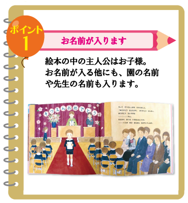 ●絵本には、主人公のお名前、卒園される園の名、卒園年度、担任の先生、メッセージが入ります。